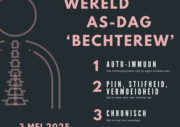 Het is vandaag wereld AS dag! Een dag waarbij we aandacht vragen voor Spondyloartritis – vroeger ‘de ziekte van Bechterew’ genoemd.