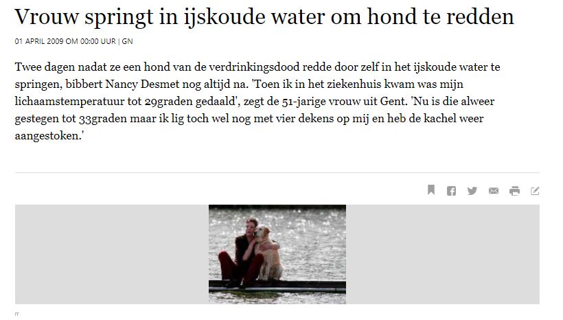 Het artikel staat hier: Vrouw spring in ijskoude water om hond te redden, De Standaard, 1 april 2009.