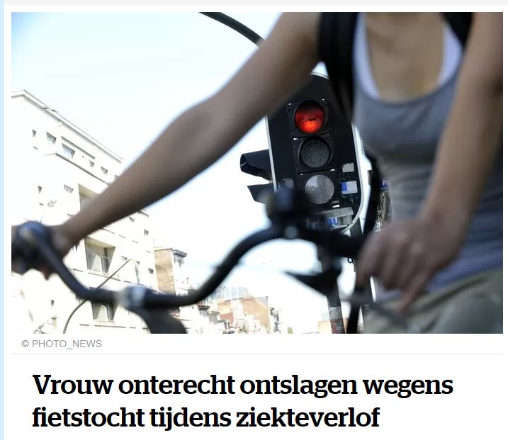 Een 33 jarige vrouw werd door haar werkgever ontslagen omdat ze tijdens haar ziekteverlof was gaan fietsen. De vrouw die op een boekhoudkantoor werkte, was een week in ziekteverlof wegens stress op het werk. In die week deed ze mee met en fietstocht voor Kom op Tegen Kanker. De dokter had ook gezegd dat de buitenlucht en de beweging haar goed zouden doen. Haar baas kwam dit echter te weten en ontsloeg haar op staande voet. De vrouw spande een rechtszaak aan en de arbeidsrechter gaf haar nu gelijk. De werkgever moet haar 8500 euro betalen. Ondertussen vond ze al ander werk.
